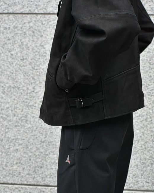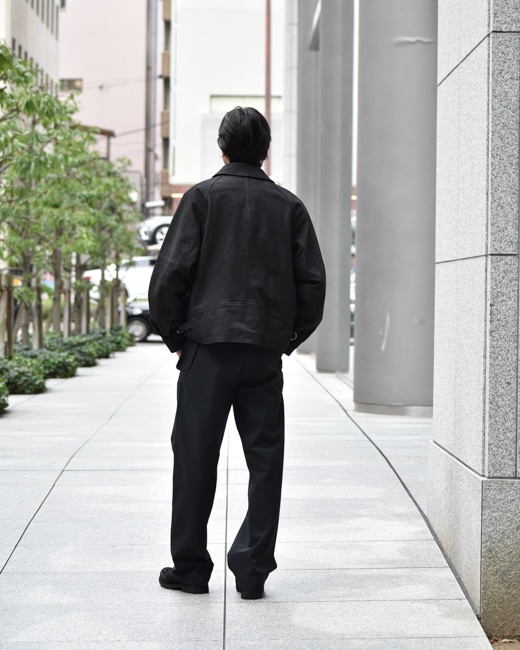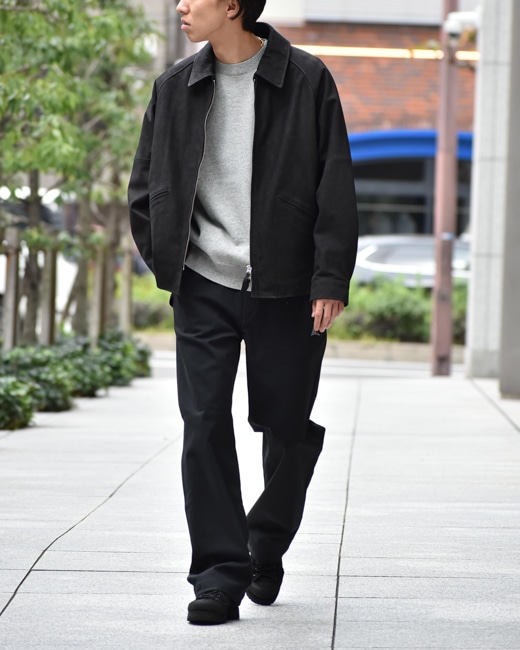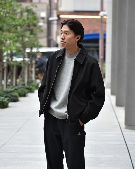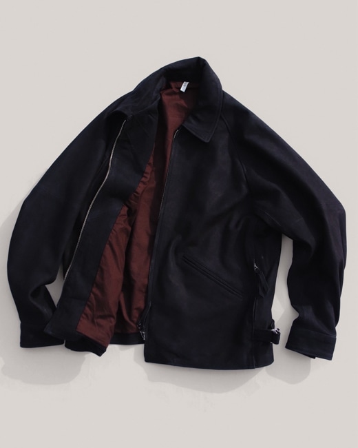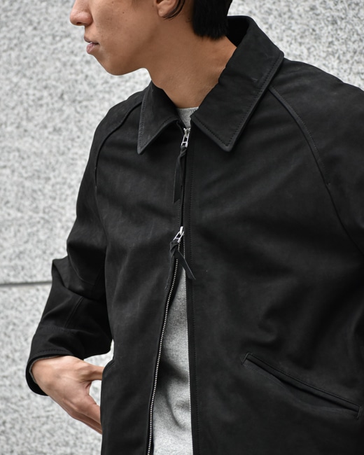 形はゆったりしたボックスシルエットのジップアップ型で、ヌバックレザーなのも有り、気を張る事なくリラックス感のあるバランスで羽織っていただけます。