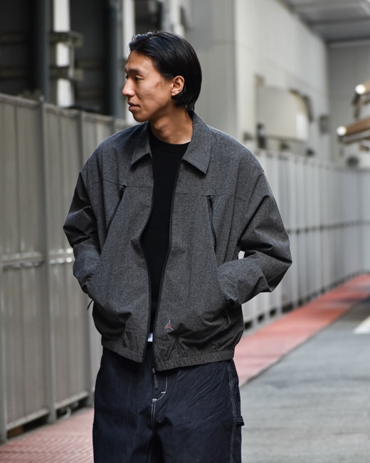 アウトドアブランドで生地の引き裂き強度を上げる為によく用いられるリップストップ生地をデザインに落とし込んだような格子柄とハの字の止水ジップのデザインが目を惹くかと。